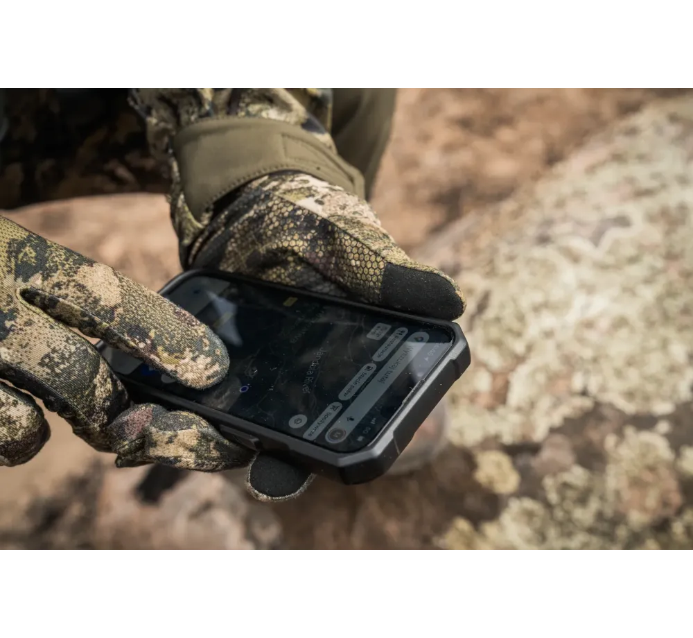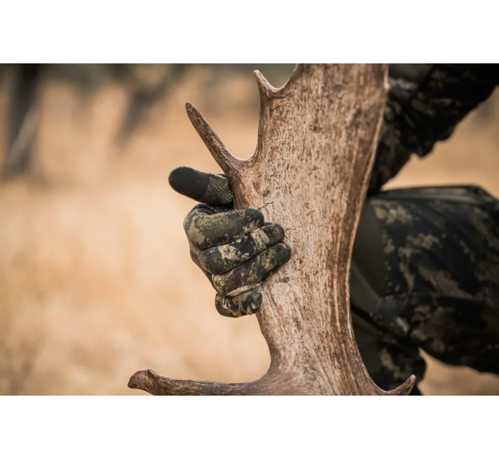Моделът е направен за активен лов и стрелба, където ръкавицата трябва да “слегне” плътно по ръката и да не пречи. Материята е лека и напълно еластична – стои удобно, позволява естествено движение и помага да усещаш добре приклада, спусъка и дребните детайли по екипировката. Върху дланта и върховете на пръстите има противоплъзгащи зони, които дават по-стабилен захват при мокро, студено или при работа с ремък, щека и друга екипировка.